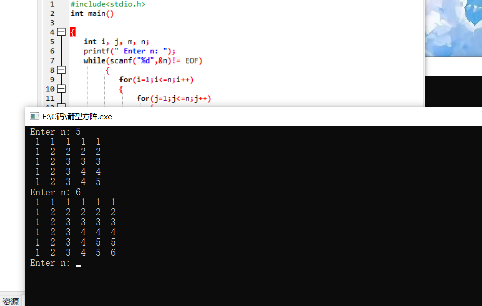 #include<stdio.h> int main() { int i, j, m, n; printf(" Enter n: "); while(scanf("%d",&n)!= EOF) { for(i=1;i<=n;i++) { for(j=1;j<=n;j++) { m=i>j?j:i; printf("%3d",m); } printf("\n"); } printf(" Enter n: "); } return 0; }