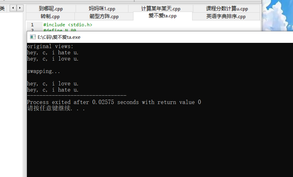 #include <stdio.h> #define N 80 int main() { char views1[N] = "hey, c, i hate u."; char views2[N] = "hey, c, i love u."; int a; char b; printf("original views:\n%s\n%s\n\n",views1,views2); for(a=0;views1[a]!='\0';a++) { b=views1[a]; views1[a] = views2[a]; views2[a] = b; } printf("swapping...\n\n%s\n%s",views1,views2); return 0; }