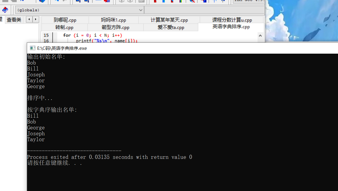 #include <stdio.h> #include <string.h> #define N 5 #define M 20 void bubble_sort(char str[][M], int n); // 函数声明 int main() { char name[][M] = {"Bob", "Bill", "Joseph", "Taylor", "George"}; int i; printf("输出初始名单:\n"); for (i = 0; i < N; i++) printf("%s\n", name[i]); printf("\n排序中...\n"); bubble_sort(name, N); // 函数调用 printf("\n按字典序输出名单:\n"); for (i = 0; i < N; i++) printf("%s\n", name[i]); return 0; } void bubble_sort(char str[][M], int n) { int i, j; char t[M]; for (i = 0; i < n - 1; i++) { for (j = 0; j < n - i - 1; j++) { if (strcmp(str[j], str[j + 1])>0) { strcpy(t, str[j]); strcpy(str[j], str[j + 1]); strcpy(str[j + 1], t); } } } }
