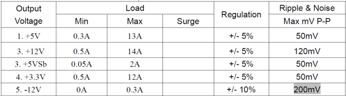 Intel在ATX12V规范中规定,+12V输出纹波峰峰值不得超过120mv,+3.3V与+5V纹波峰峰值不得超过50mv