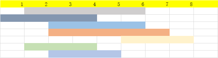 ①将每一个区间按照左端点递增顺序排列,拍完序后为[1,4],[2,4],[2,6],[3,5],[3,6],[3,7],[6,8]。