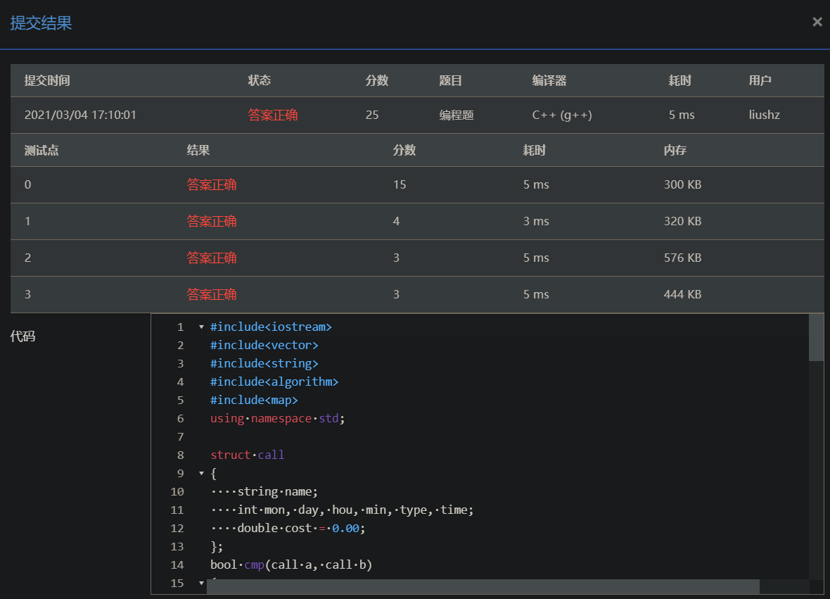 先接收输入,将每次拨出和挂断信息存入结构体中,输入时将时间点换算成总分钟方便计算时间差,然后用sort将同一客户的通话记录按时间增序排序,不同客户按姓名增序排序