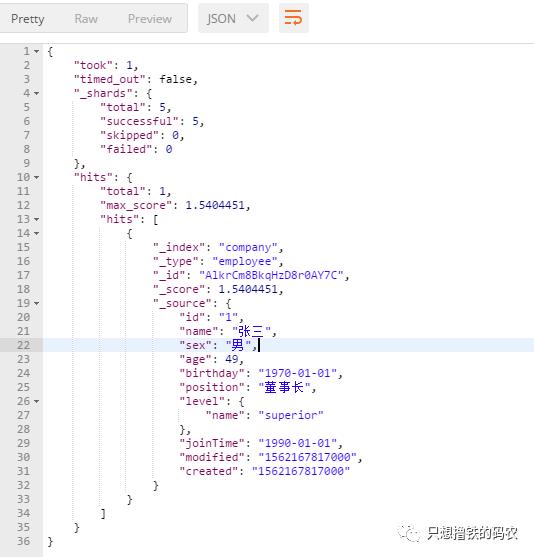 //添加文档 POST http://192.168.197.100:9200/company/_doc //没有sex字段的文档 { "id": "1", "name": "张十", "age": 54, "birthday": "1960-01-01", "position": "程序员", "joinTime": "1980-01-01", "modified": "1562167817000", "created": "1562167817000" } //sex字段值为null的文档 { "id": "1", "name": "张十一", "age": 64, "sex":null, "birthday": "1960-01-01", "position": "程序员", "joinTime": "1980-01-01", "modified": "1562167817000", "created": "1562167817000" }