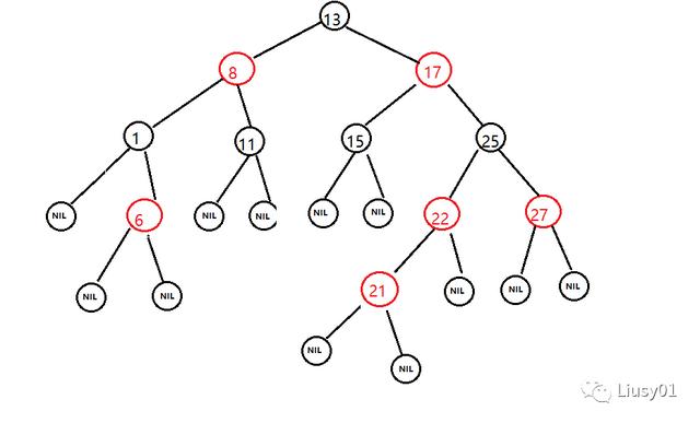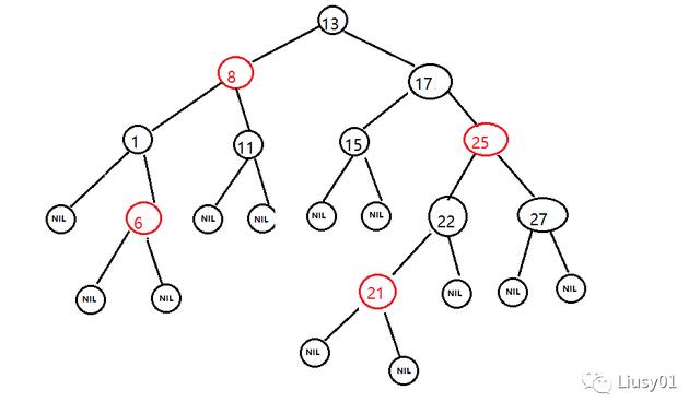 可以看到,整棵树是违反规则5的(从任意节点到其每个叶子节点的所有路径都包含相同数量的黑色节点。),比如13->6有2个黑节点,而13->21有3个,所以这是需要进行左旋转。