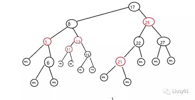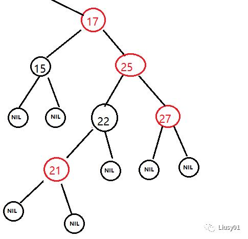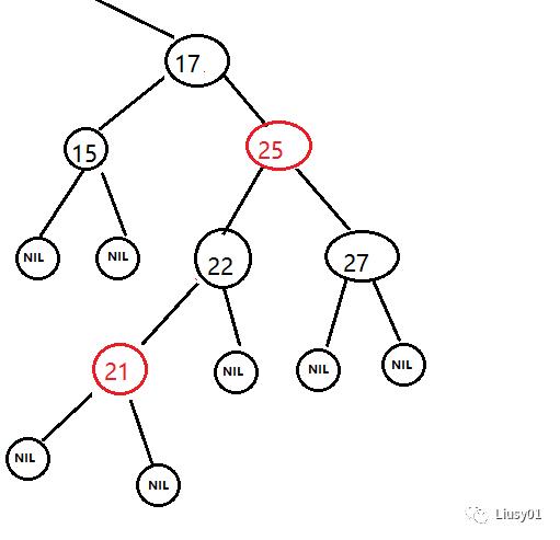 此时变色之后破坏了规则5(从任意节点到其每个叶子节点的所有路径都包含相同数量的黑色节点。),比如17->15只有1个黑色节点,17->21有两个黑色节点。