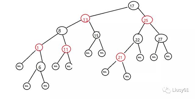 此时左右子树违反了规则5的(从任意节点到其每个叶子节点的所有路径都包含相同数量的黑色节点。),比如17->7有3个黑色节点,但17->21才2个黑色节点,此时将13进行变色