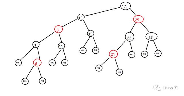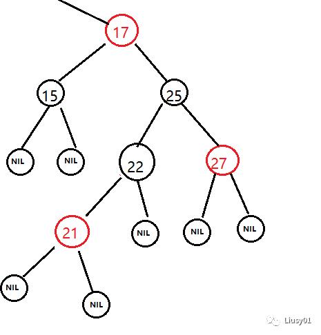 此时违反了规则3(每个红色节点的两个子节点都是黑色节点),需要把17和27都变成黑色