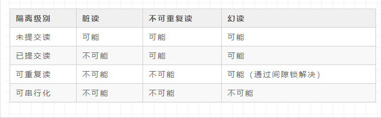 同一个事务中多次读取同样的记录的结果是一样的。可能导致幻读,在多次读取间隙中,可能有其它事务插入新的记录,就会出现幻读。