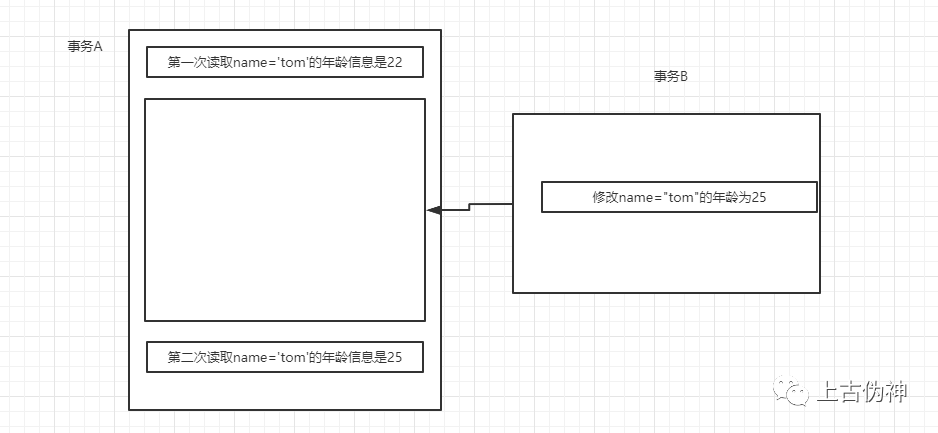 一个事务从开始直到提交之前,所作的修改对其他事务是不可见的。也称为不可重复读,因为执行多次一样的查询,可能得到不一样的结果。