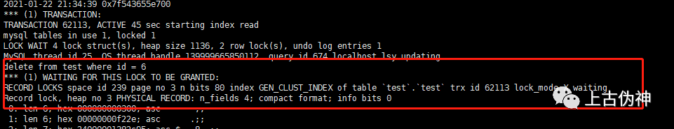 3、在事务1中删除test表中id=6的数据