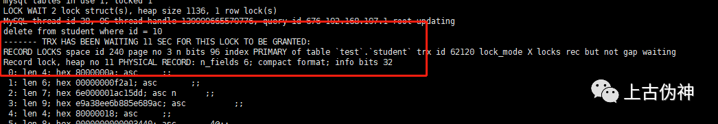 4、在事务2中删除student表中id=10的数据
