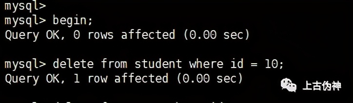 1、在事务1中先删除student表中id=10的数据