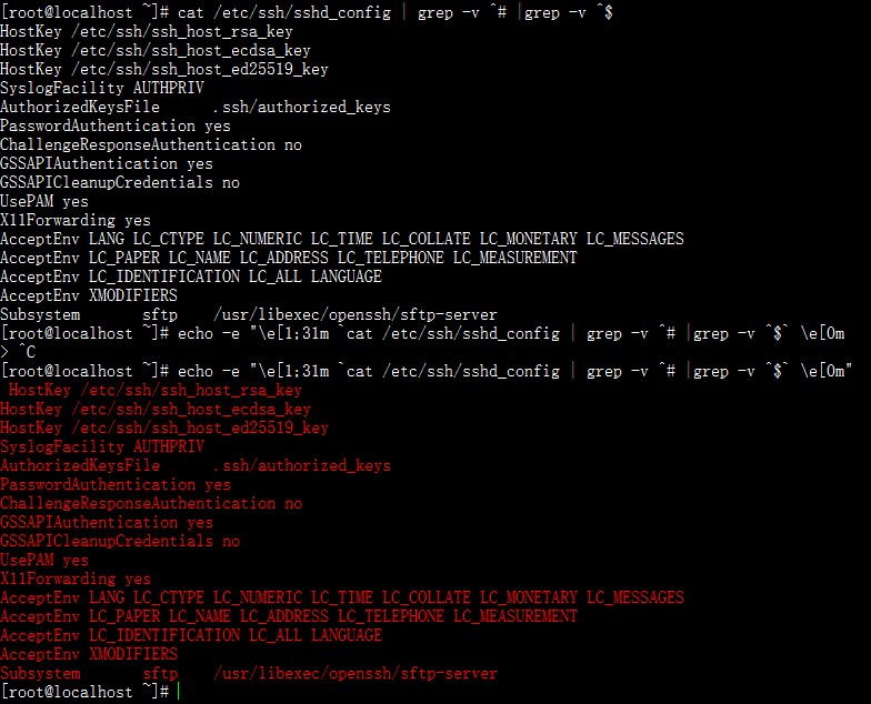 [root@localhost ~]# echo -e "\e[1;31m `cat /etc/ssh/sshd_config | grep -v ^# |grep -v ^$` \e[0m"