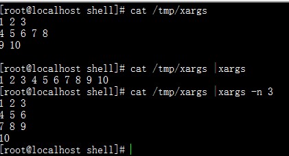 [root@localhost shell]# cat /tmp/xargs |xargs -n 3 #-n参数为划分为多行