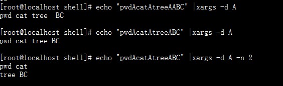 [root@localhost shell]# echo "pwdAcatAtreeABC" |xargs -d A -n 2