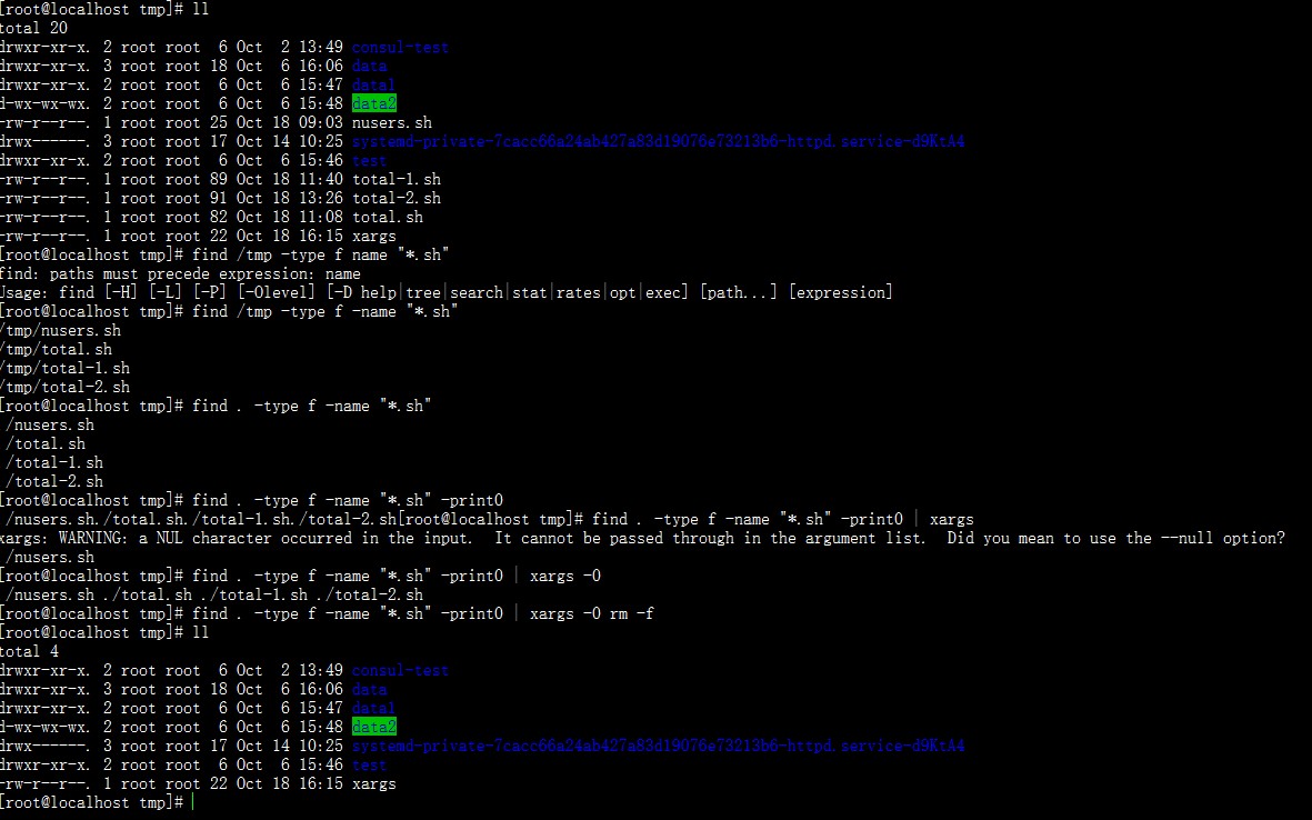 [root@localhost tmp]# find . -type f -name "*.sh" -print0 | xargs -0