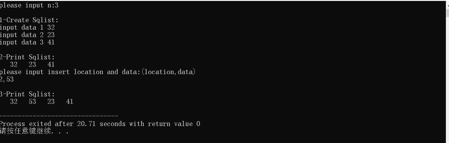 printf("input e=");scanf("%d",&e);/*输入欲插入元素的值*/