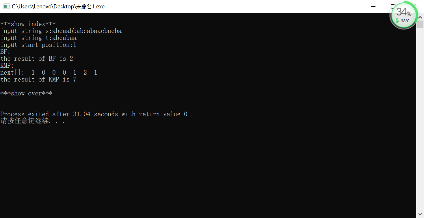 printf("the result of KMP is %d\n",index_kmp(&s,&t,k,next));