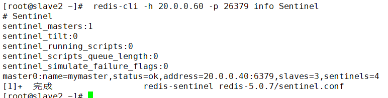 [root@slave2 ~]# redis-cli -h 20.0.0.60 -p 26379 info Sentinel