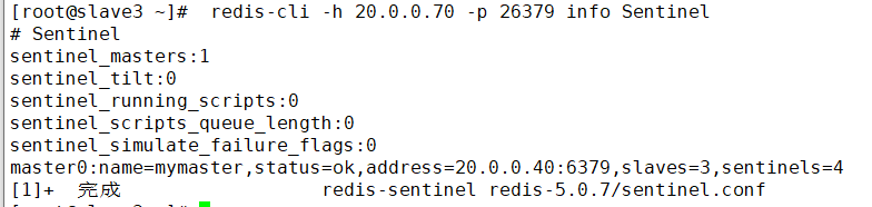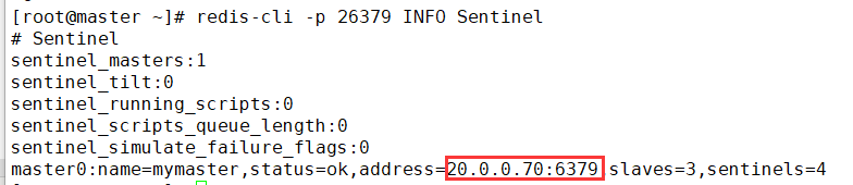 [root@slave3 ~]# redis-cli -h 20.0.0.70 -p 26379 info Sentinel