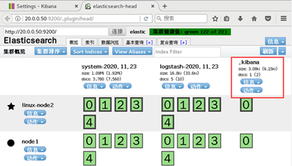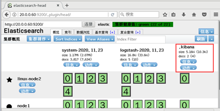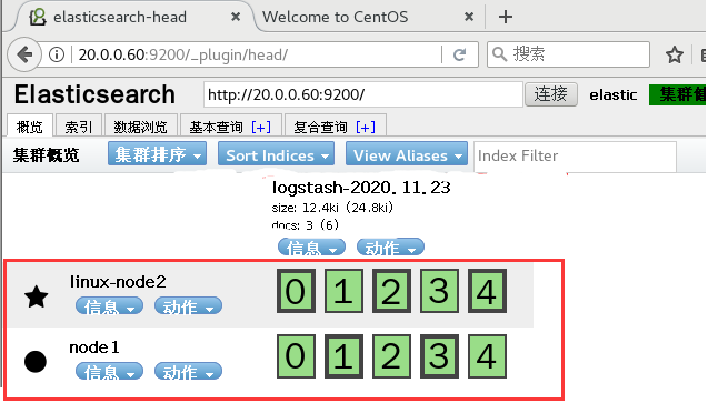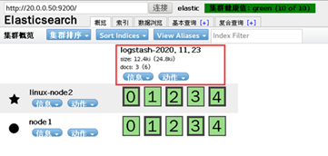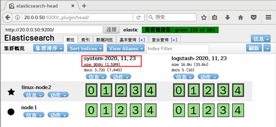 [root@node1 yum.repos.d]# vi /etc/elasticsearch/elasticsearch.yml 找到69行 将括号内的内容替换成node1 node2的地址 discovery.zen.ping.unicast.hosts: ["20.0.0.50", "20.0.0.60"]