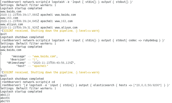 [root@apache bin]# logstash -e 'input { stdin{} } output { elasticsearch { hosts => ["20.0.0.50:9200"] } }'