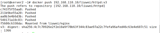 [root@server2 ~]# docker push 192.168.110.10/liuwei/httpd:v3