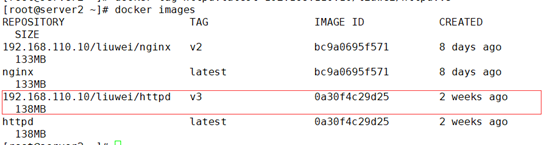 [root@server2 ~]# docker tag httpd:latest 192.168.110.10/liuwei/httpd:v3