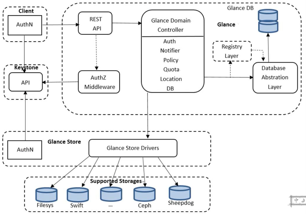 OpenStack的操作都需经Keystone进行身份认证(AuthN)并授权(Authz),Glance也不例外。Glance是一个C/S架构,提供一个REST API,用户就通过RESTAPI来执行镜像的各种操作。Glance Domain Controller是一个主要的中间件,相当于调度器,作用是将Glance内部服务的操作分发到以下各个功能层