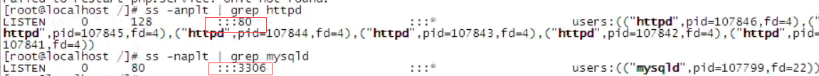 ss -anplt | grep httpd #查看httpd启动情况,80端口监控表示httpd已启动 ss -naplt | grep mysqld #查看mysqld启动情况,3306端口监控表示mysqld已启动