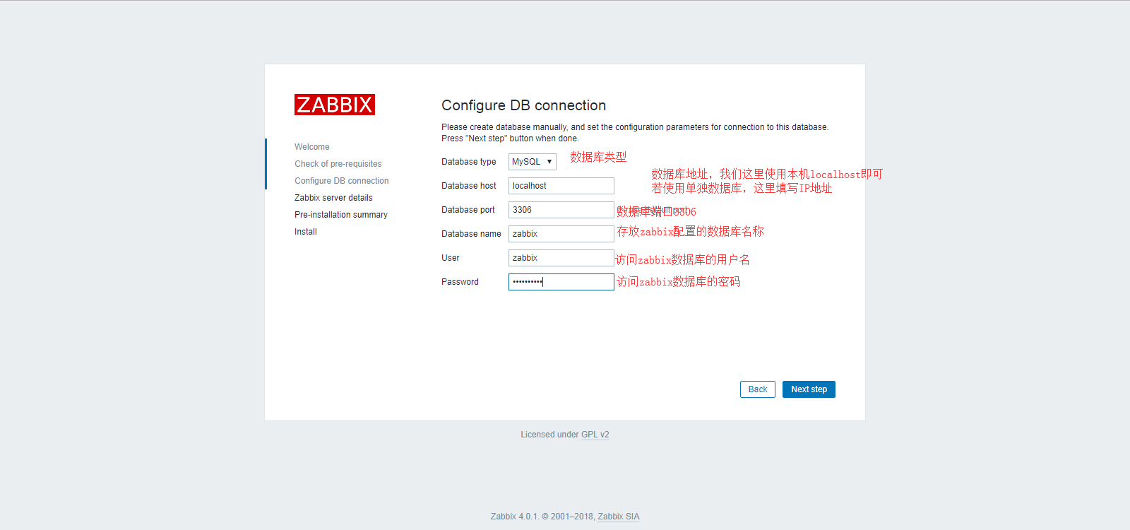 输入zabbix数据库的密码,继续