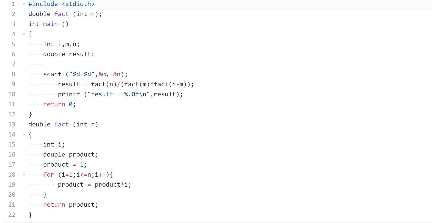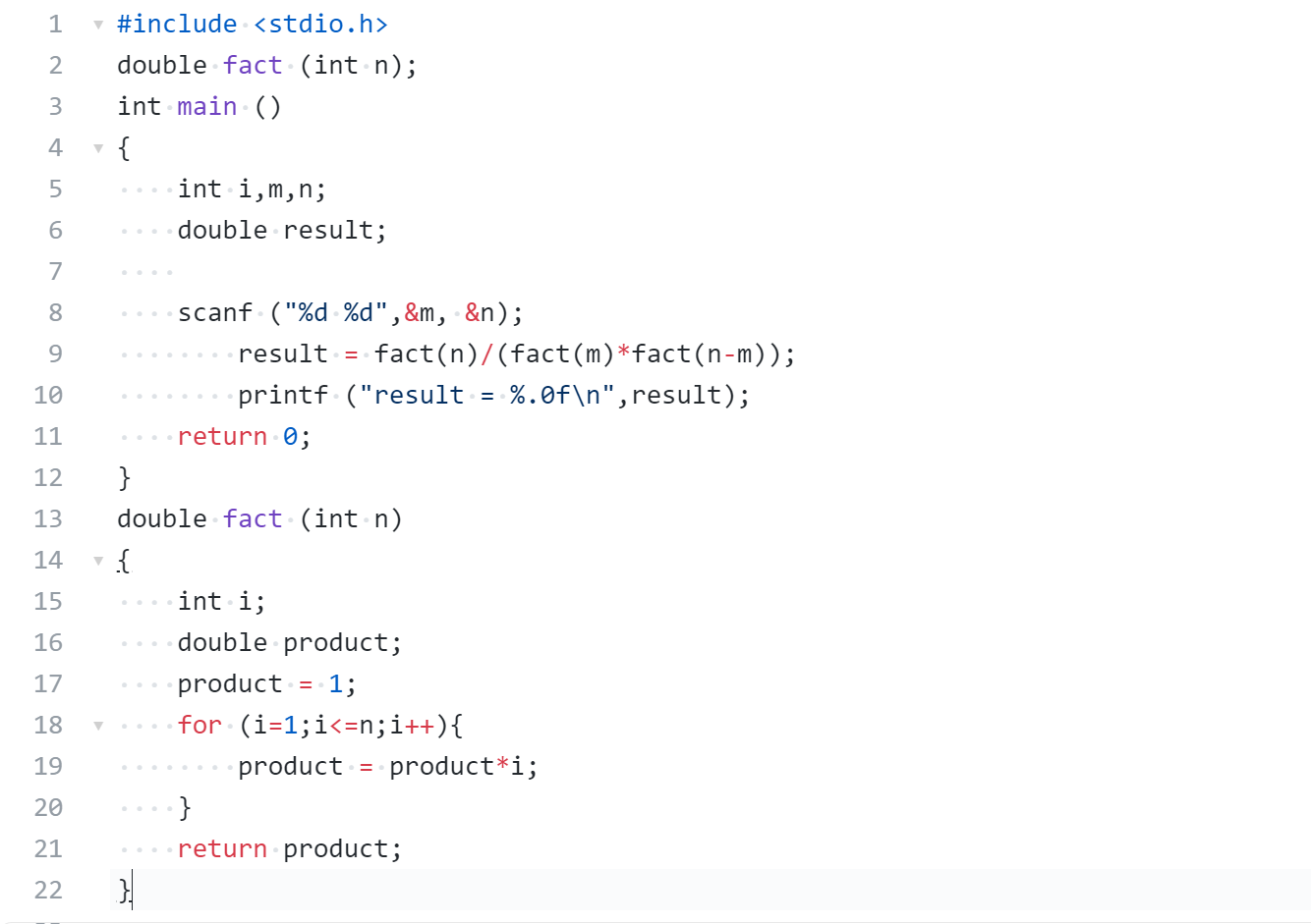 | 题目内容描述:根据公式算出从n个不同元素中取出m个元素(m≤n)的组合数。建议定义和调用函数fact(n)计算n!,其中n的类型是int,函数类型是double。 | |