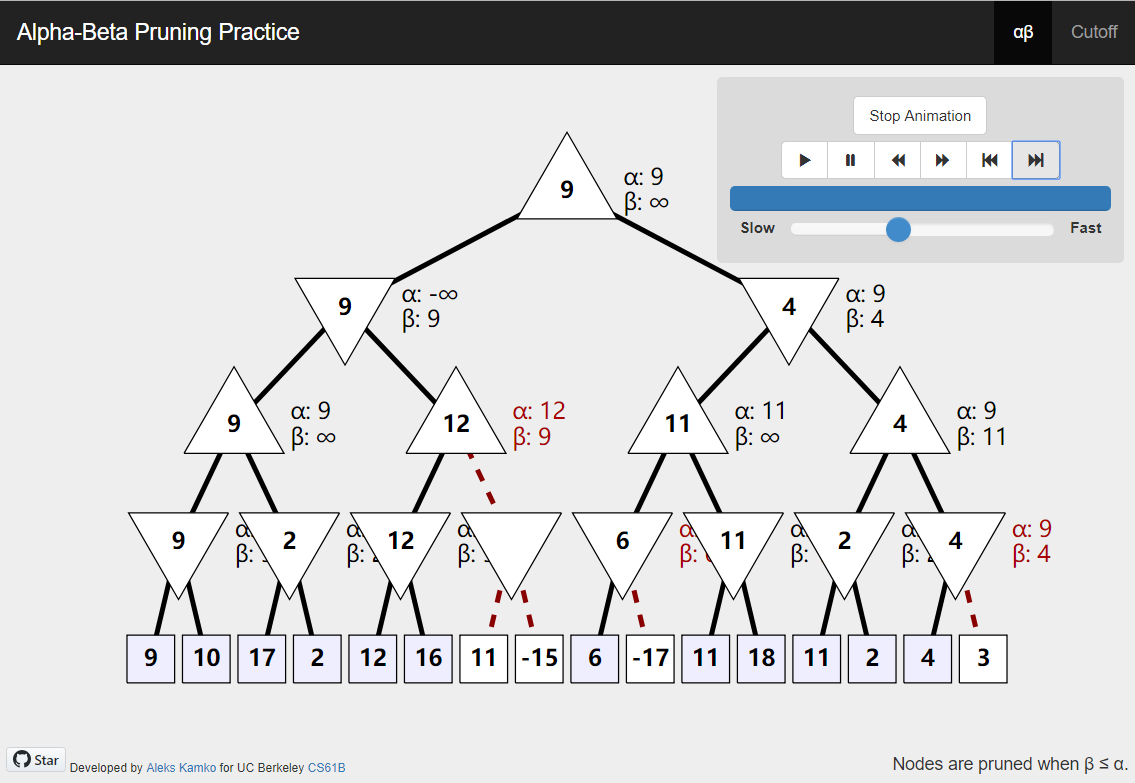 - 简单来讲,alpha和beta值在初始化的时候,是父节点直接传递给子节点的;而子节点回传时,Min层节点将自己的beta值传给父节点,而Max层节点将自己的alpha值传给父节点;Min层父节点挑选回传值中最小的一个,跟当前层beta值比较,用较小值重新设置beta;Max层父节点挑选回传值中最大的一个,跟当前层alpha值比较,用较大值重新设置alpha;如果任一节点发现当前alpha>beta,则放弃遍历。