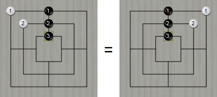 - 对当前局面的评估,仅仅与局面本身有关,与形成此局面的招法顺序无关,如下面的两种招法形成的局面是一致的: