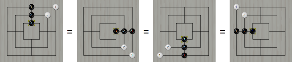 - 对任一局面,它的3个旋转局面跟它的评价值是相同的,如: