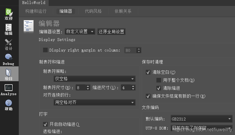 1. 第1个问题:在Qt Creator中打开项目,点击左侧工具栏“项目”,在“编辑器”选项卡中把“默认编码”改成“GB2312”。如下图所示: