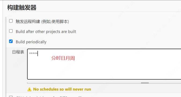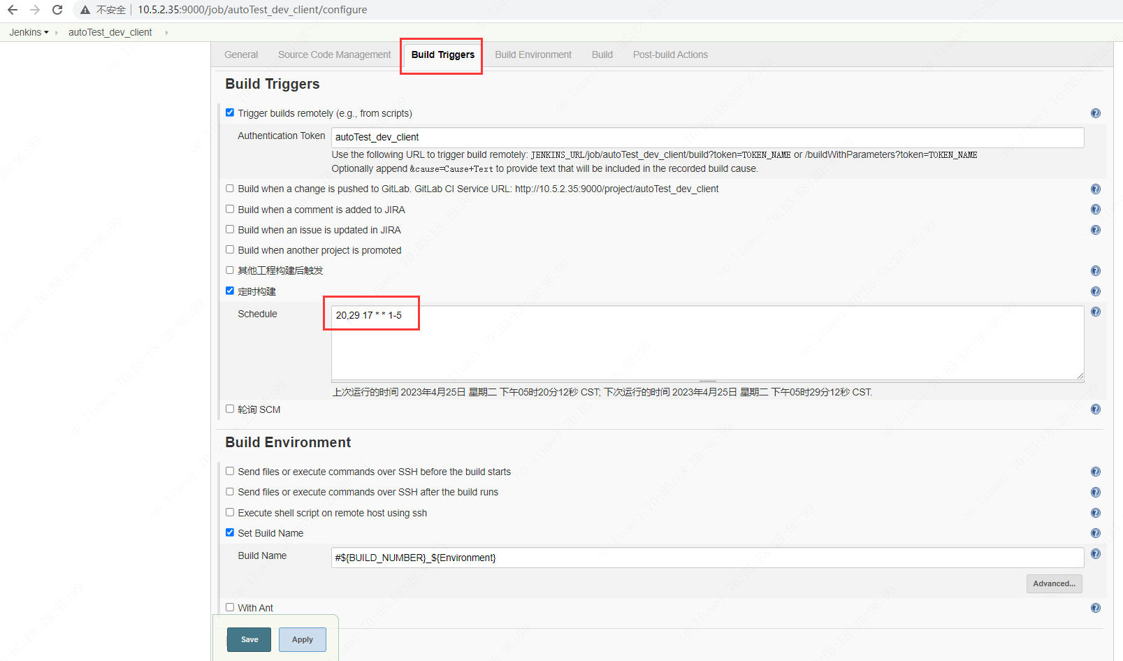 勾选定时构建,20,29 17 * * 1-5表示,每周一到周五,17点20分,17点29分各执行一次