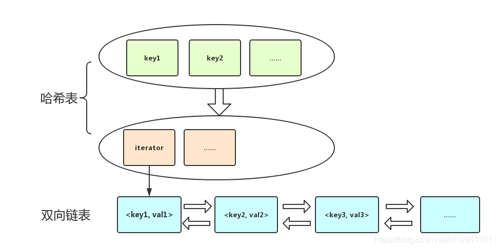 这么设计的目的是,在插入和遍历时,可以利用利用双向链表的灵活性,进行随机地插入元素,同时因其迭代器永不失效,所以可以作为哈希表中的value;查找时可以利用哈希表的特性,基于关键字key做平均常数时间复杂度的快速查找。