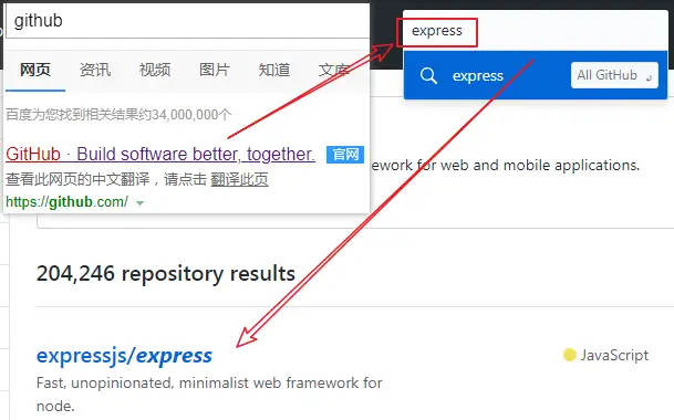 1、下载Node.js,GitHub搜索express,使用nodejs安装express(npm install express)。