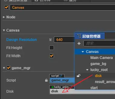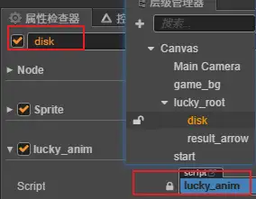 将luckyanim.js绑定到disk节点上(左下图),设置Canvas绑定的用户自定义脚本gamemgr的disk属性值为disk节点。