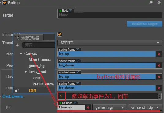 在scripts中新建gamemgr.js,添加onsendhttpclick方法,当点击开始按钮的时候调用此方法。将gamemgr用户自定义脚本绑定到Canvas上,选中start按钮节点,修改start开始按钮节点上的Button组件的Click Events属性值为1,回车,然后将Canvas拖入,选中gamemgr,选中onsendhttp_click方法。如此,单击开始按钮就会调用此方法。