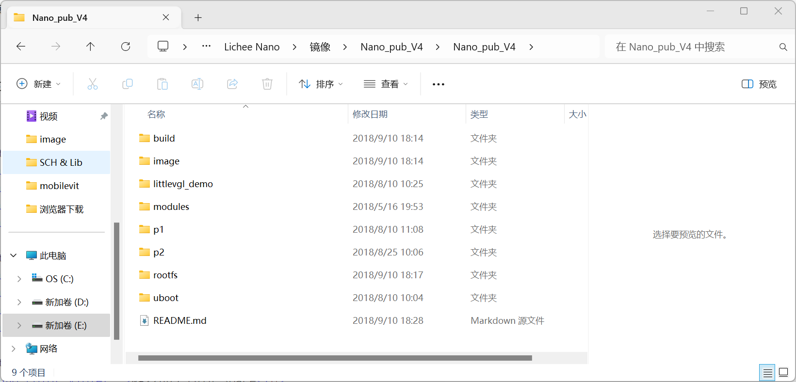 到手可以直接烧录官方镜像到TF中,烧录软件我用的是 Win32DiskImager,可以直接搜索到。这里需要下载官方的资料包,连接为:Lichee Nano_免费高速下载|百度网盘-分享无限制 (baidu.com) 下载好了以后解压文件可以看到文件夹中有镜像文件夹,电极进入选择一个版本解压,这里我选择Nano_pub_v4,在Nano_pub_v4文件中有以下几个文件。