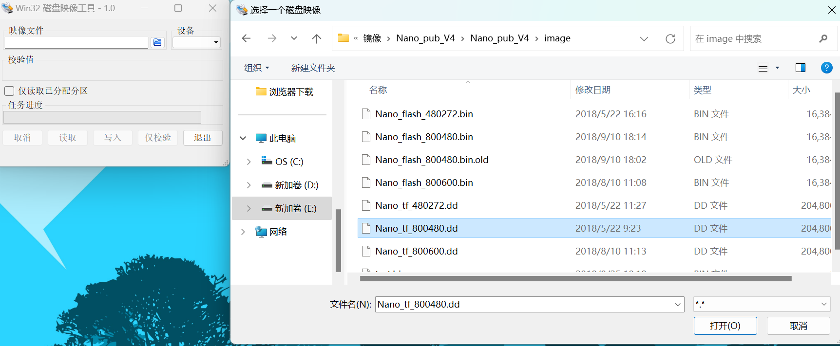 这里先不介绍各个文件夹的作用,对于最开始想体验荔枝派的使用可以直接在image文件夹中选择合适分辨率的镜像。比如可以选择Nano_tf_800480.dd这个镜像。首先打开win32软件,选择Nano_tf_800480.dd后直接写入即可。