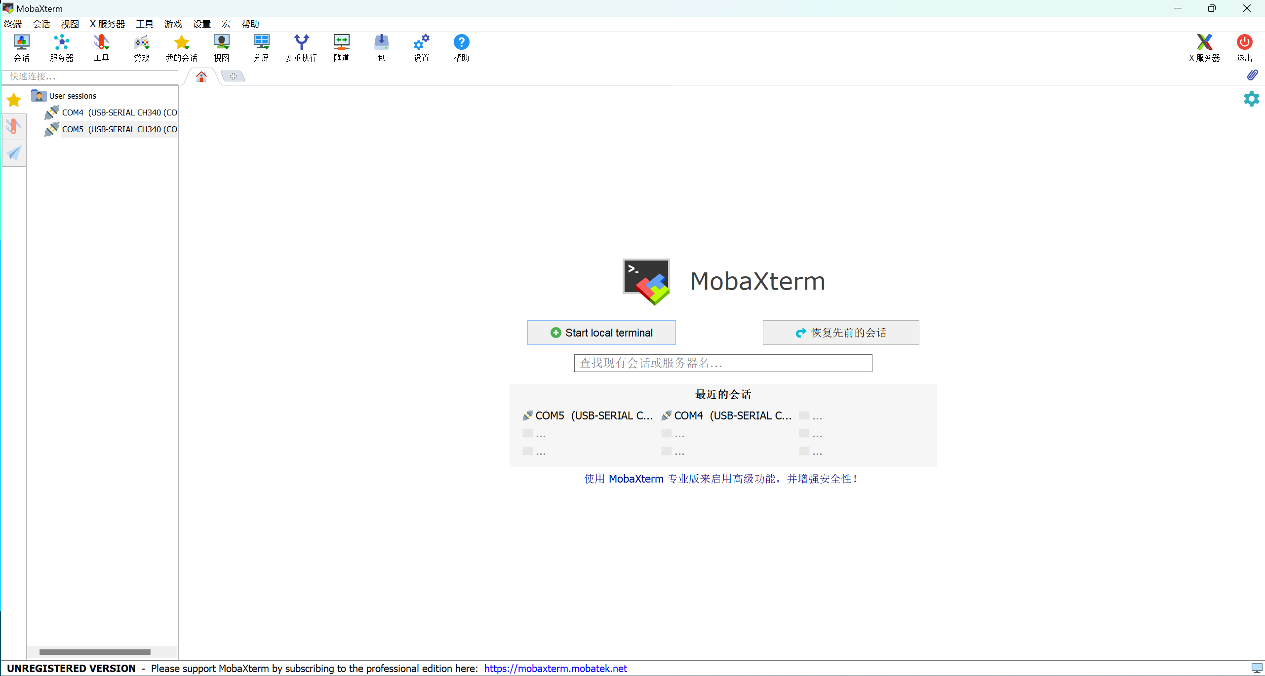 将TTL转串口街上电脑,使用一个终端工具将电脑与开发板连接,我是用的是MobaXterm,可以搜索一下它的中文版本。打开MobaXterm,界面如下: