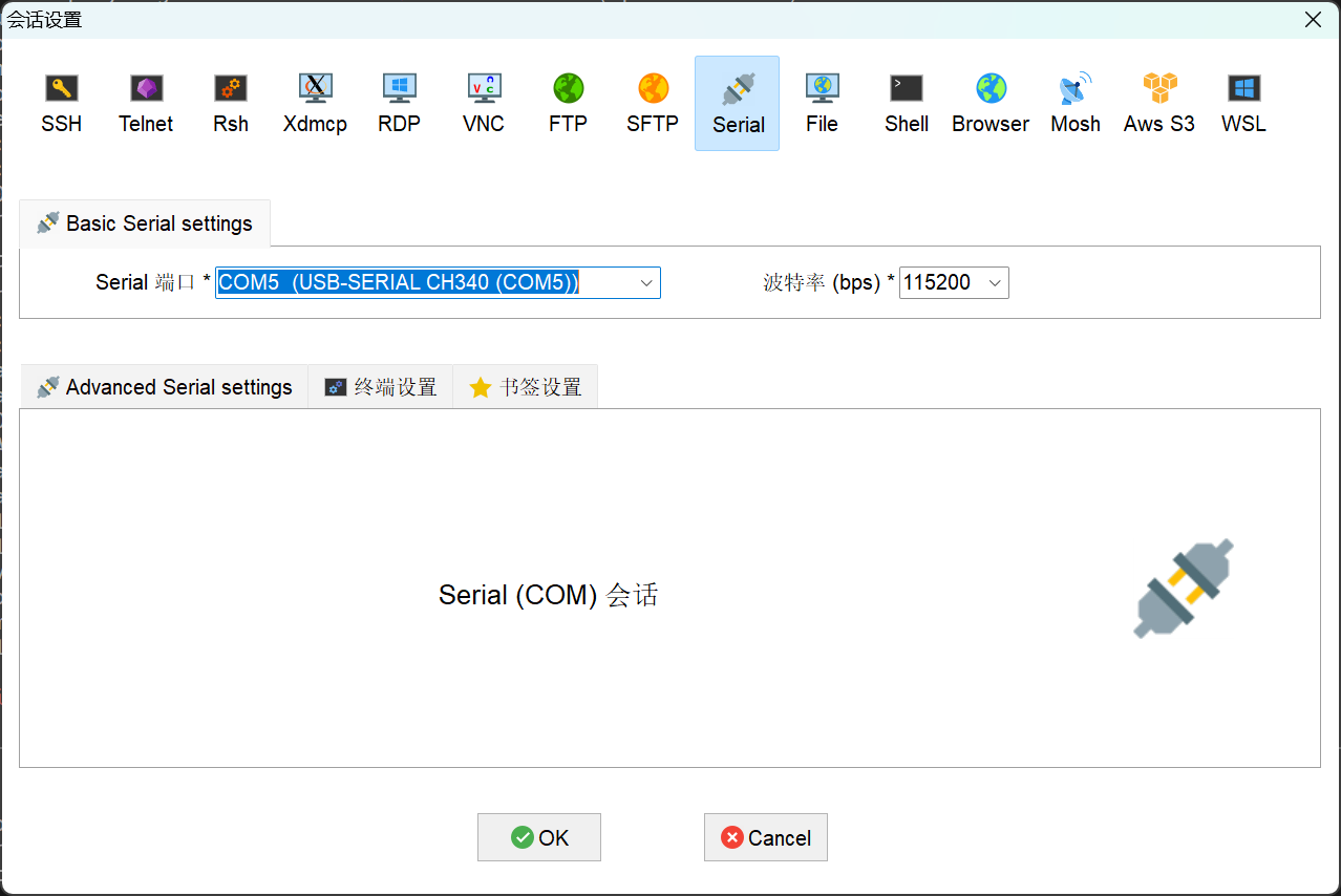 右上角选择会话,创建串口连接,选择正确的串口端号,不知道的可以在右键电脑开始——>设备管理器——>端口中查看,比如我的这个端口号是com5。所以在MobaXterm中选择COM5,波特率选择115200.