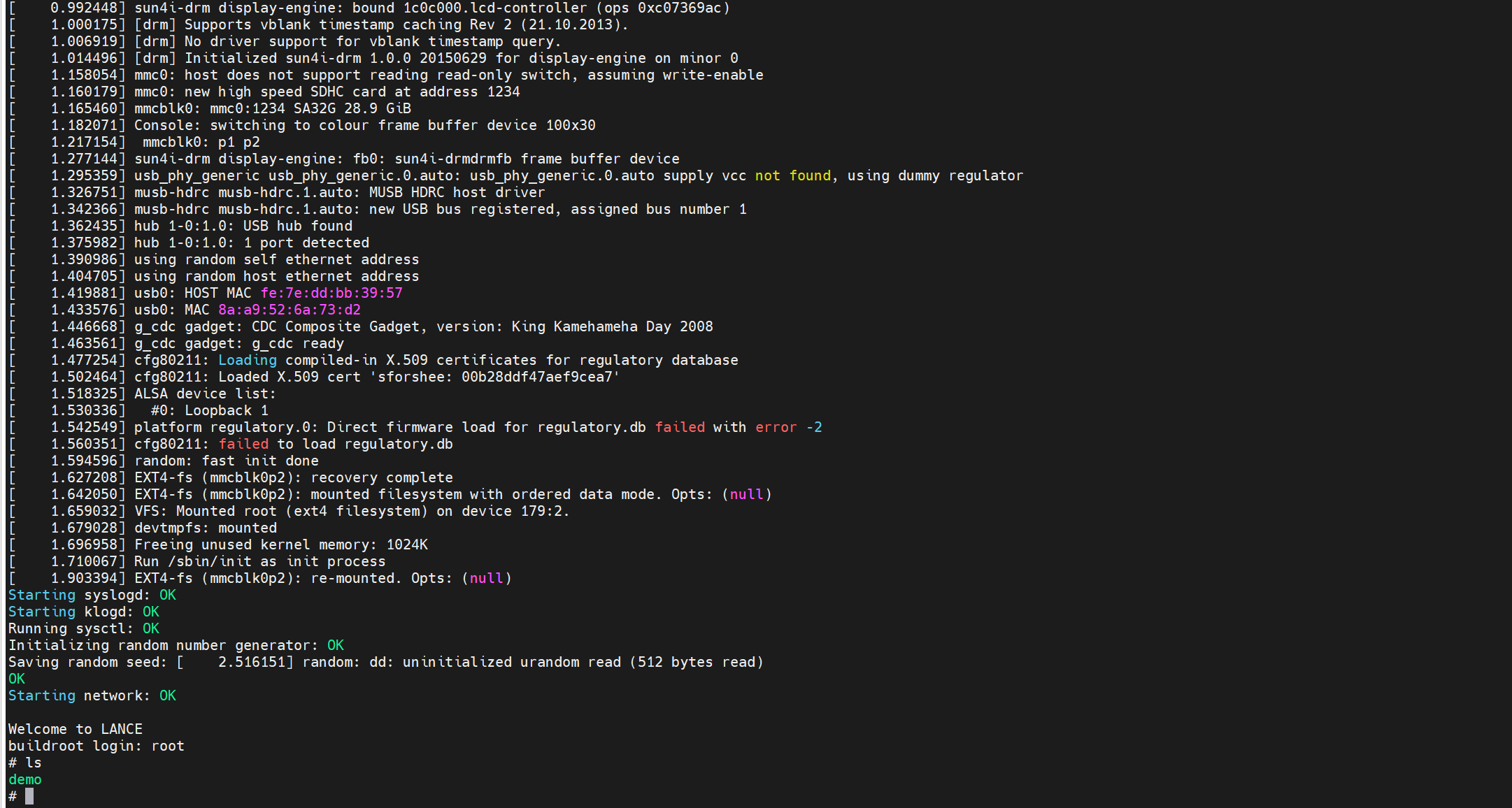 点击 ok,进入到开发板的终端界面。输入root,回车后,还要输入密码,官方镜像密码为licheepi。这里演示的是我自己编译的镜像,我没有设置密码,所以仅仅输入root即可。使用Linux中的ls命令可以看到文件夹中的文件。到此,最初的上手使用就完成了,其实非常简单,但是对于开始学习的我来说,我根本不知道相关东西是啥,本来寄希望于官方的教程,谁知道教程不是给我这种新手看的呢。下章将记录自己编译uboot和内核的内容,也是踩坑很多、花费时间最多的一个环节。