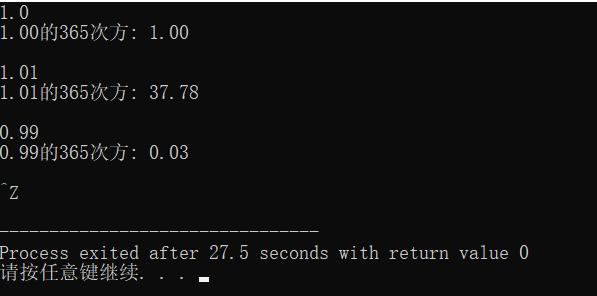//多次计算X的365次方 #include <stdio.h> #include <math.h> int main() { double x, ans; while(scanf("%lf", &x)!=EOF) { ans = pow(x, 365); printf("%.2f的365次方: %.2f\n", x, ans); printf("\n"); } return 0; }