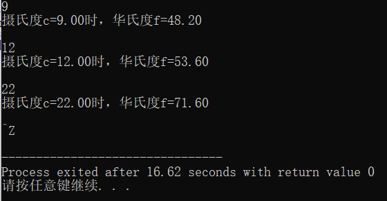 //多次实现摄氏度和华氏度转换 #include <stdio.h> #include <math.h> int main() { double f, c; while(scanf("%lf", &c)!=EOF) { f =(9.0/5)*c+32; printf("摄氏度c=%.2f时,华氏度f=%.2f\n", c, f); printf("\n"); } return 0; }