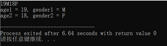 //从键盘输入两组人员的年龄,性别数据 #include <stdio.h> int main() { int age1, age2; char gender1, gender2; scanf("%d%c%d%c", &age1, &gender1, &age2, &gender2); printf("age1 = %d, gender1 = %c\n", age1, gender1); printf("age2 = %d, gender2 = %c\n", age2, gender2); return 0; }