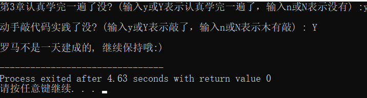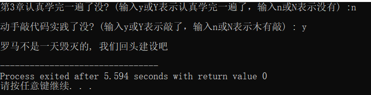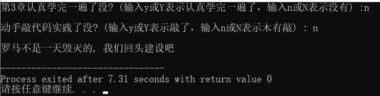//罗马不是一天建成的 #include <stdio.h> int main() { char ans1, ans2; printf("第3章认真学完一遍了没? (输入y或Y表示认真学完一遍了,输入n或N表示没有) :"); ans1 = getchar(); getchar(); printf("\n动手敲代码实践了没? (输入y或Y表示敲了,输入n或N表示木有敲) : "); ans2 = getchar(); if ((ans1=='y'||ans1=='Y')&&(ans2=='y'||ans2=='Y')) printf("\n罗马不是一天建成的, 继续保持哦:)\n"); else printf("\n罗马不是一天毁灭的, 我们回头建设吧\n"); return 0; }